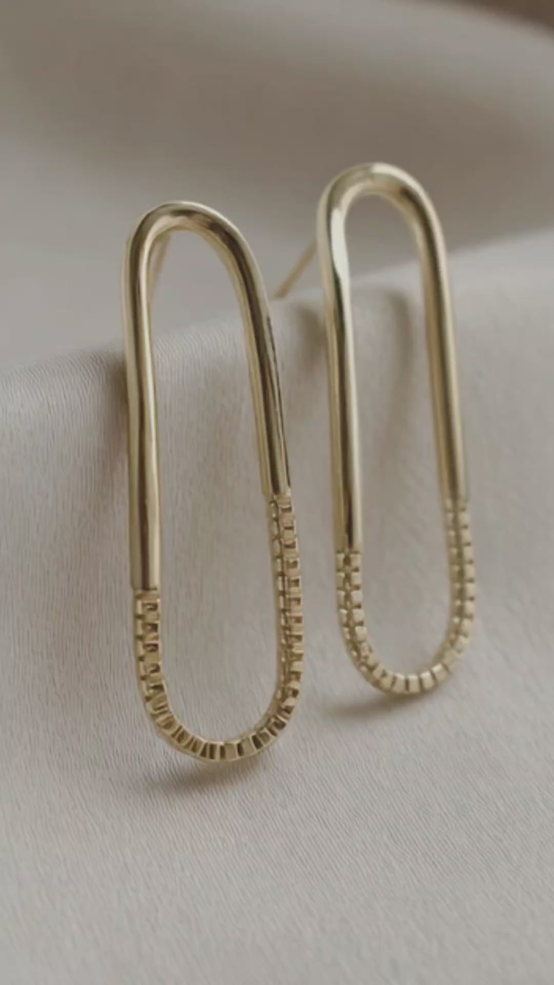 Emma earrings are brass, coated with shiny gold. Featuring an oval form paired with a delicate squared link chain. Modern, elegant, and timeless.